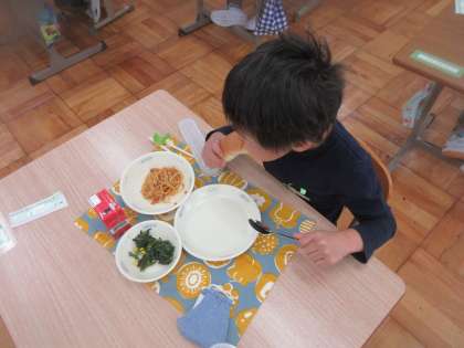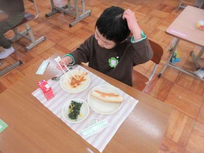 1年生にとって初めての給食でしたが,自分でしっかりと食べる姿が見られました。おかわりをする子もおり,ごちそうさまの時には「おいしかった。」と教えてくれました。