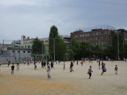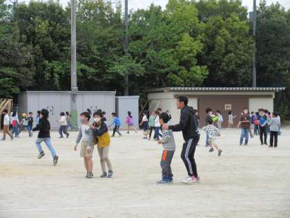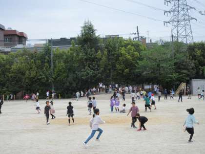 子ども達だけでなく、先生も一緒に運動場で過ごしています。
