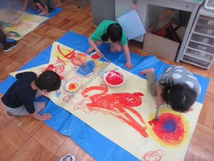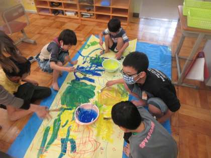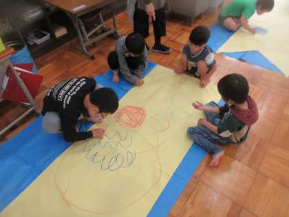 大きな模造紙にこいのぼりを描きました。クレパスで模様を描いた後,絵の具を塗りました。みんな夢中になり,楽しそうに取り組んでいました。