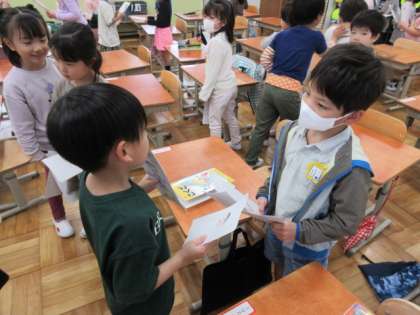 いよいよ会の始まりです。教室を音楽に合わせて歩き回ります。音楽が止まったところで、近くにいる(園が同じでなかった人)にガッチャンして、名前と好きなものを言い合いました。照れながらも一生懸命話している姿がとてもかわいかったです。