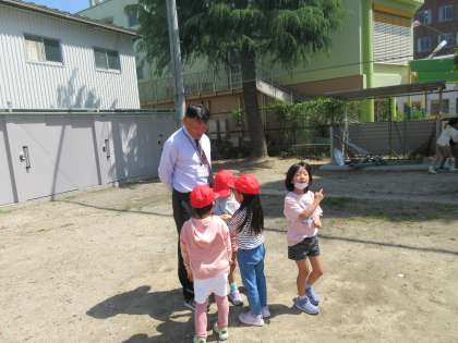 1年生が運動場で見つけたダンゴムシを校長先生にみせていました。