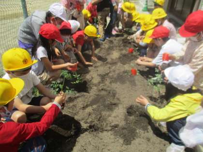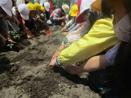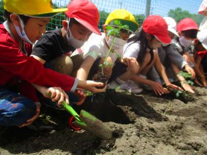 今日は、みんなで一生懸命雑草を抜いて、たっぷり栄養を与えたふかふかの土に、苗を植えました。