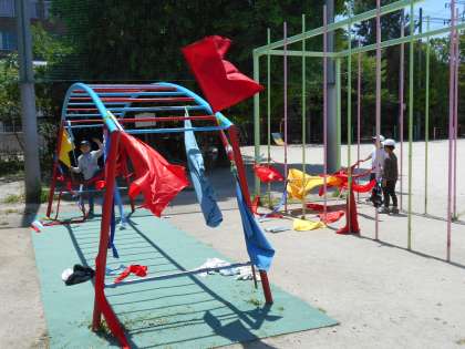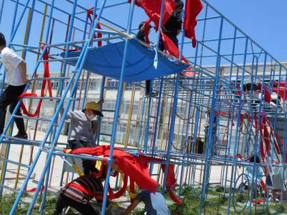 総合遊具や雲梯を使って、布で造形遊びを行いました。一人で始めて、次第に友だちと協力して学習を進めました。