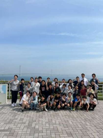 明石海峡大橋をバックにクラス写真の撮影です。まずは1組から。