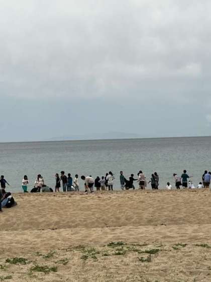 宿泊する慶野松原荘に到着しました。入館式の前に砂浜で学年写真を撮影します。