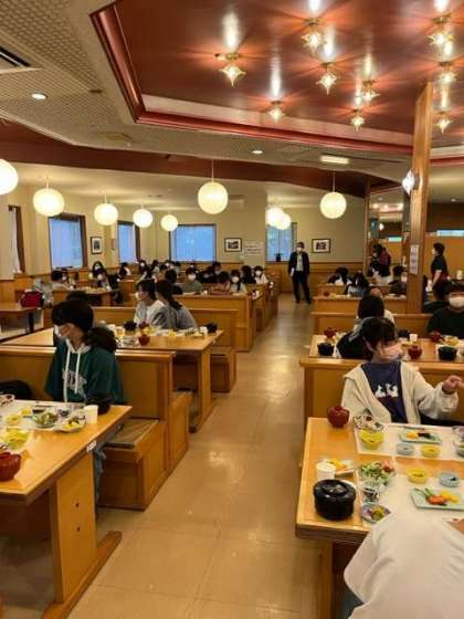 たくさんのメニューがテーブルに並んでいます。食事係さんのいただきますで食べ始めます。たくさん食べて元気に過ごせるようにしましょう!