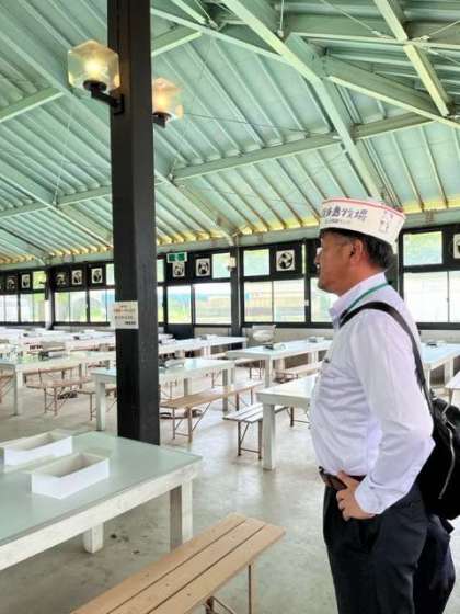 乳しぼり体験が始まります。帽子を被って、校長先生も準備万端です!