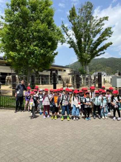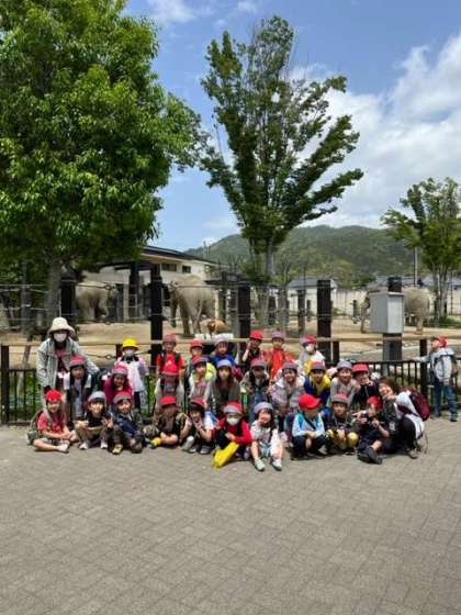 ゾウの前でクラス写真を撮影しました。とっても近くでゾウを見ることができましたね。