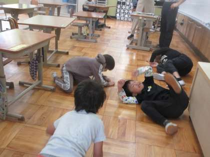 外国語の学習をしました。先生方から、挨拶の仕方や数の数え方を教えてもらいました。「タイニー・ボッパー」の絵本の読み聞かせでは、お話に合わせてジャンプしたり、転がったり、並んだりしました。1から10までの数を数えたり歌ったりして楽しい時間になりました。