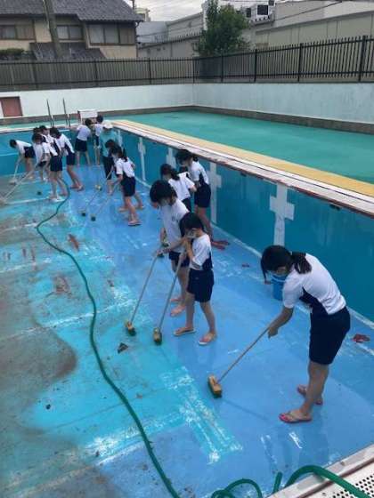 先日6年生のみなさんでプール清掃を行いました。管理用務員さんをはじめ、先生方とも協力をして、ぴかぴかに磨き上げてくれました。