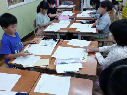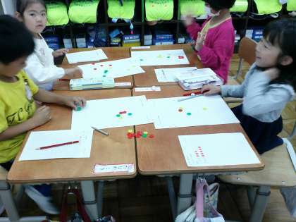 算数科「いくつといくつ」では数を2つに分ける学習をしています。椅子取りゲームをして考えたり、サイコロ,おはじきカードなどを使って、遊びの中からいくつといくつが身につくように取り組んでいます。今週から「いくつといくつ」のカードが宿題となります。さっと答えが出るように練習を頑張ってほしいと思います。