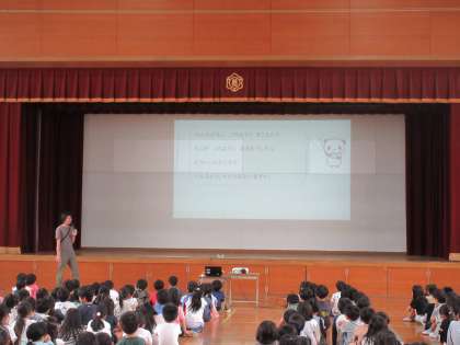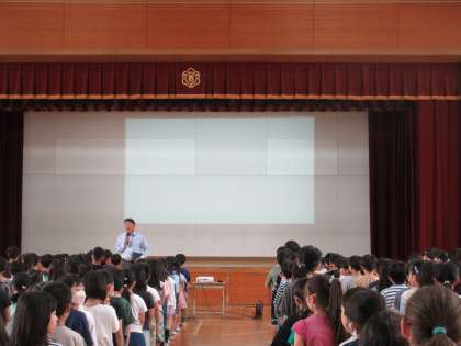 全校で集会形式の朝会を行いました。