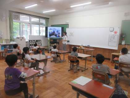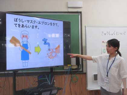 栄養教諭の先生から毎日食べている給食について色々なことを教えていただきました。給食室の様子や献立の材料について楽しく学習しました。機械でじゃがいもの皮をむく様子は興味深く見入っていました。献立にどんな材料が使われているのかを皆で考えました。
