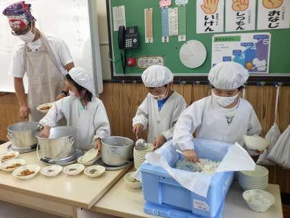 「ハイ,給食の準備です。」に「わーい!」とはじける笑顔の子どもたち。