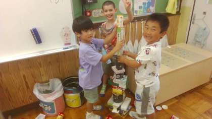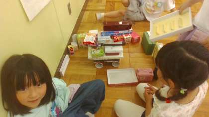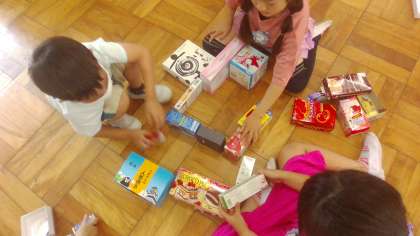 今日はみんなが算数の学習のために持ってきたたくさんの箱で、図工の「いっぱいつかってなにしよう」という学習をしました。形をいろいろと考えて、工夫して積んだり並べたりしていました。同じような形の箱をきれいに並べたり、高い塔を作りたいと頑張って積み上げたり、トラックを作ってみようと転がる材料と積み上げる材料を工夫して重ねたり、とても楽しそうに作っていました。