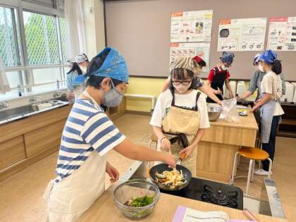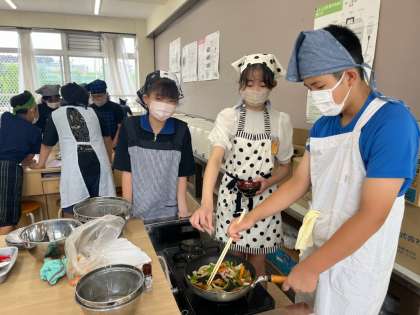 食材を切ったあとは、鍋に油をひき炒めます。中火から強火にすることも忘れずできました。焦げないようにしっかり菜箸で混ぜています。いいにおいが家庭科室に広がります。あいている人は、積極的に洗いものを!すばらしい。