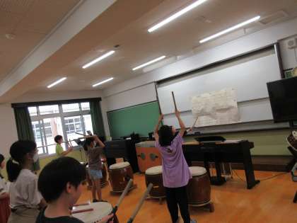 音楽室をのぞいてみると、担当の先生の声にあわせて力強い太鼓の音が聞こえていました。