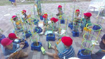 アサガオの観察でつるを観察しました。つるの伸び方もみんなそれぞれで、たくさん伸びた人で支柱の上まで伸びていました。また、つるの先ががふわふわしているのを観察して、どうやって伸びていくのか不思議に感じている友だちもいました。