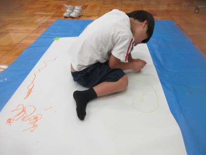 サマースクール1日目。元気よく登校してくる子どもたち。とてもいい顔をしていました。「海に行って泳いだよ。」「スタンプラリーをしたよ。」等,夏休みにしたことをたくさん教えてくれました。絵本の読み聞かせやダンスをした後,模造紙に絵を描きました。それぞれ好きなように描いていました。