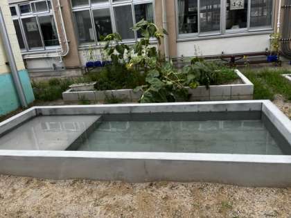 夏休み工事が行われ、8月18日に地域より「みんなの池」として引き渡していただきました。徐々に生物が定着し、子ども達にとっての憩いの場になればいいなと思います。