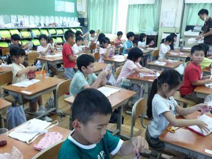 楽しみにしていた「しぼりぞめ!」揉んで揉んで、絞って絞って、コーヒーフィルターをつけると…なんときれいな色に染まりました。子ども達は、同じように見えていた絞った水が、いろんな色に染まったのを見て驚いていました。染めた後は、指を使って絵を描きました。染めたコーヒーフィルターで紙の朝顔を再現し絵にします。楽しみです。