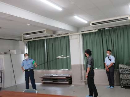 避難訓練の後は、右京署の指導のもと、教職員で刺股の研修を行いました。