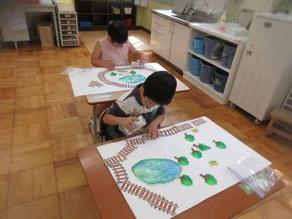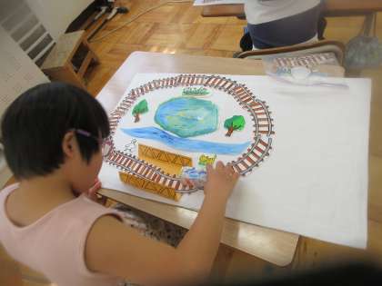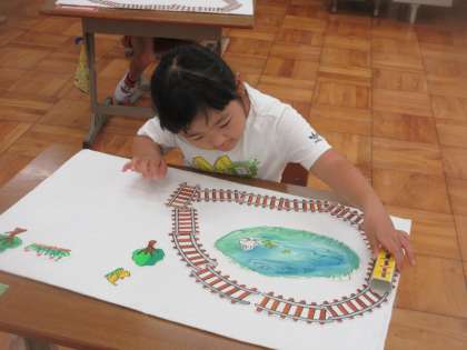 国語は絵本の読み聞かせから場面の様子を考えたり絵本の中の言葉を学んだりする学習を行いました。くり返しの言葉のリズムを楽しみながら、せんろをつないだり登場人物の動作を真似たりして楽しく学習を進めることができました。