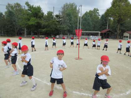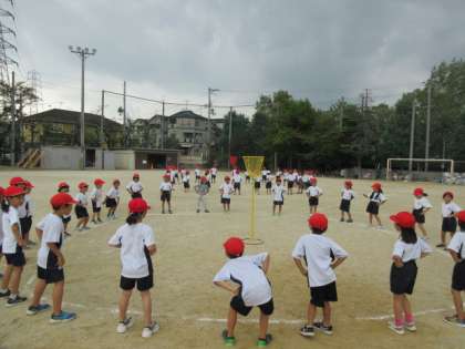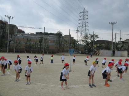 運動場でリズム玉入れの練習をしました。