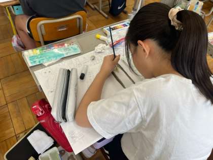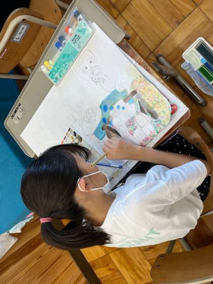 お話の絵の学習では、採色の段階に入った児童も多くいます。絵の具、パス、コンテを使って、自分の想像した世界を表します。一つ一つの色にこだわって、色づくりを行う姿が素敵でした。