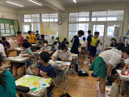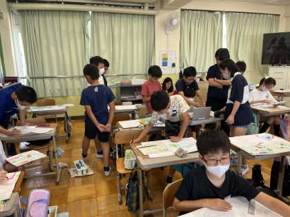 1・2時間目にどのクラスも図工に取り組んでいたので、10分間ほど交流の時間をとりました。自分のクラスの友達だけでなく、違うクラスの友達の作品も鑑賞しながら、新たな刺激を受けることができていました。お話の内容は違うものの、技法や表現の工夫など真似できるところはどんどん取り入れていってくれたらなと思います。