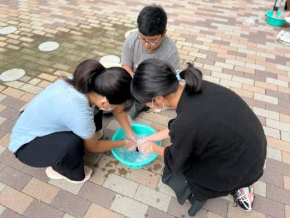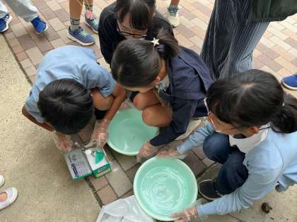 3組では、実際に靴下の手洗いをしました。水2リットルに洗剤を2.5グラム入れ、液を作り、もみ洗いやつまみ洗いをします。洗ったあとはすすぎ洗いを2度行いました。