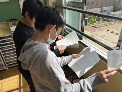 本日、山の家のしおりを各クラスで綴じていきました。