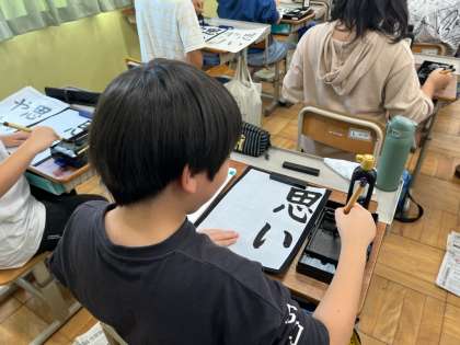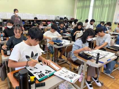 書写の学習では「思いやり」と書きました。手本をしっかり見て、始筆の筆のおき方や終筆での筆の動かし方を考えながら書くことできました。