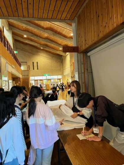 館内に入り、シーツを渡してもらいました。ボランティアの先生が大活躍です。