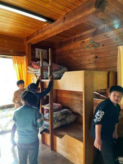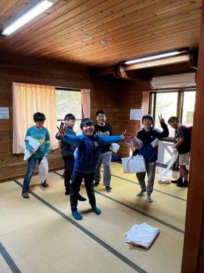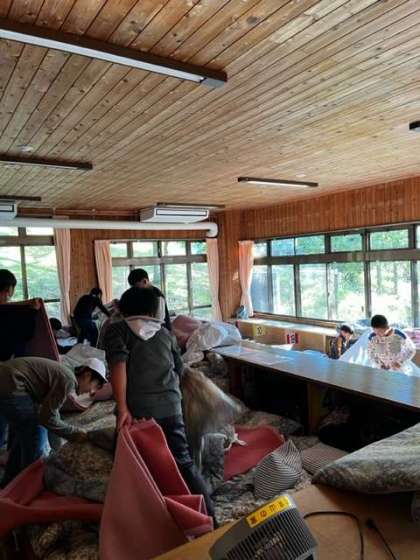 宿泊棟に移動して、荷物整理や寝具準備をしています。時間にかなりゆとりをもって活動ができています。