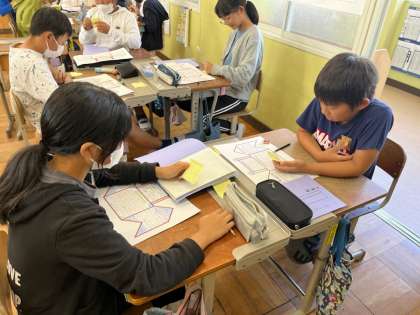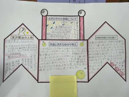 国語科では、「やまなし」を読んで作品や宮沢賢治に対して感じたことや考えたことをまとめた「かにカード」を使って交流しました。ペアになって、友達の考えに対して自分はどう思うのかふせんに書き、伝えながら渡しました。まとめ方もそれぞれで、楽しみながら交流することができました。