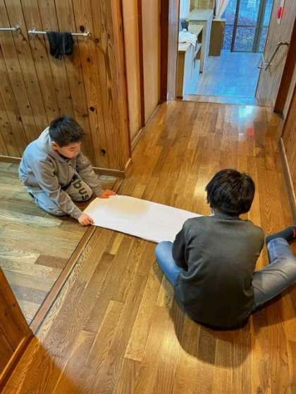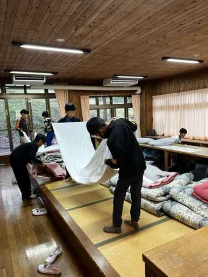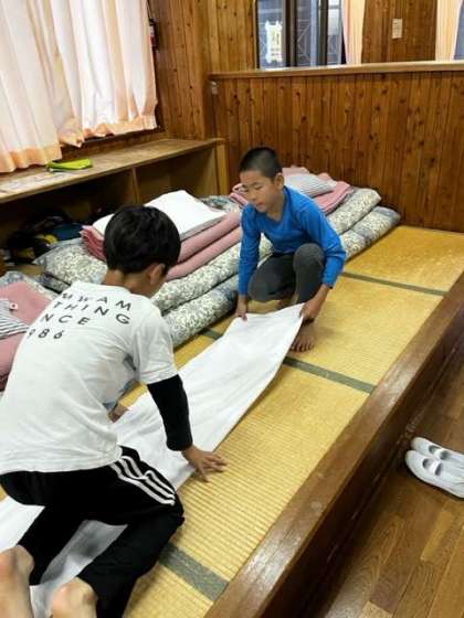 子ども達のは6時に起床し、シーツたたみが始まりました。