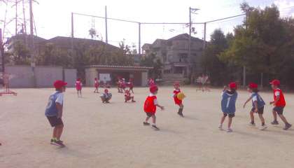 運動場でパスゲームをしています。同じチームの人にボールを上手にパスするには、どうすればいいかな?よりたくさんゴールするには、どうすればいいかな?と作戦を立てながら学習を進めました。1年生の時の学習も思い出しながら、頑張っています。
