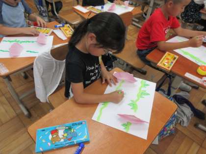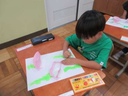 アサガオの花の色水で染めた紙を使って、絵をかきました。