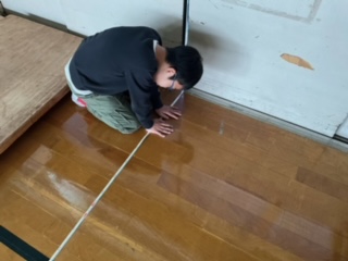 体育館の横の長さをはかりました。メジャーとものさし、どっちではかるか考え「メジャー」を選び、体育館に移動。すぐさま、長さをはかっていました。mやcmにも気をつけて長さを読むこともできました。
