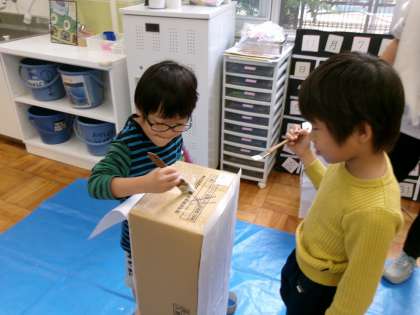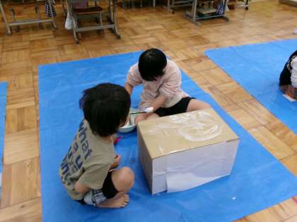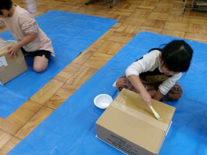 学習発表会にむけて大道具をみんなで作りました。ペアで水のりやボンドをダンボールにぬりました。ハケを使って、ていねいにぬった後に白い紙をはりました。集中して根気強く仕上げられました。