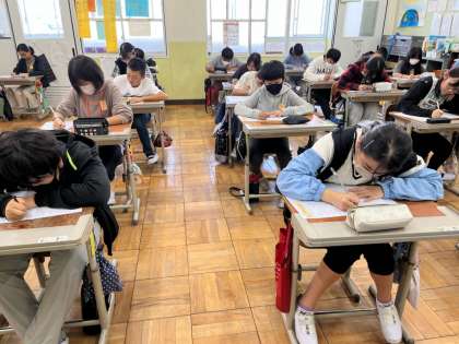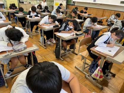 テストに向かう姿勢は真剣そのもの。45分間の授業時間、いっぱいいっぱい使って考える子どもたちもたくさんいました。これまで小テストに向けた学習や、この50問テストに向けた学習の成果がためされるものです。結果を見て、自分の学習法、学習量はよかったのか見直す機会にしてほしいなと思います。