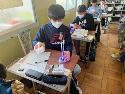 まずは、LEDライトを光らせ、材料を手にしながらどんな作品にしようか想像を膨らませました。アイディアスケッチをしながら想像を広げている子どもたちもいました。