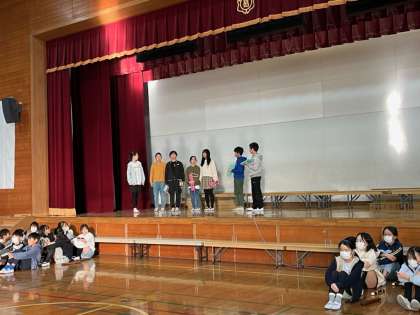 今日は1時間目に、発表の初めから終わりまでの動きの確認をしました。舞台袖や舞台前を使って、それぞれが違う動きをするので、どのタイミングで出るのか、どのタイミングで動くのかしっかりと確認をしました。