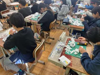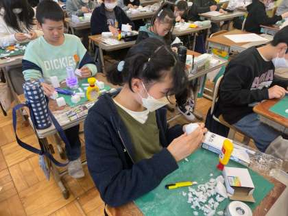 図画工作科ではでは立体の学習を進めています。スポンジとストローを利用して、カッターで切ったスポンジをつないだり、組み立てたりし、光の効果を考えながら作品作りに取り組んでいます。作っているうちに、色々なアイデアが思いついているようでした。