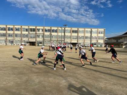 体育科「タグラグビー」の学習では、タグラグビーのルールや動きに慣れてきたところで、1組・2組・3組合同の交流戦を行いました。