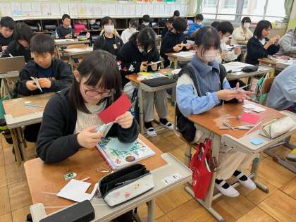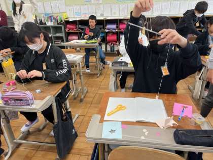 2学期最後の理科の学習では、「てこのはたらき」の学習を生かして、モビール作りに挑戦しました。ストローにつける飾りを画用紙で作り、飾りがつりあうようにストローに紐でつけていきます。少しのずれでつりあいがとれなくなるので、難しさを感じながらも、楽しみながら作っていました。
