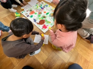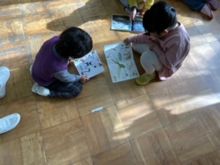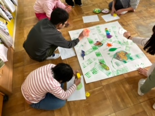 西京極西小学校で小さな巨匠展の作品作りをしました.作る作品を絵本から考えたり、台紙に各々が作った葉っぱを貼ったりしながら交流しました.