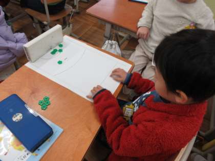 ゲームをしながら、10点ゾーンに入ったおはじきの数を比べると、どちらの点数が大きいかが分かることに気付いていました。