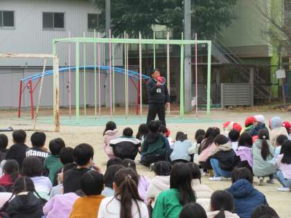 葛野小学校では、避難 訓練を19日(金)の中間休みに実施しました。休み時間なので、教室にだけでなく、運動場や中庭、廊下などにいた児童もたくさんいて、地震 発生(訓練)の放送で、子どもたちだけで机の下に入ったり、運動場の 真ん中に集まったりするなど、身を守る行動をとっていました。